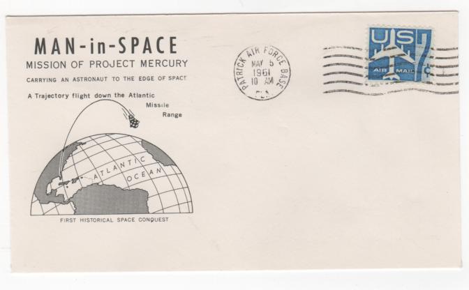 This cover commemorates the date of the USA's first manned space launch. Mercury Astronaut Alan B. Shepard was aboard the "Freedom 7" space capsule atop the Redstone rocket and was launched into a sub-orbital flight downrange where he flew for 15 minutes. The space capsule was recovered in the Atlantic Ocean later that morning by the USS Lake Champlain. The cover has a printed cachet by Space Craft # 3b and was machine cancelled on the day of the flight at Patrick AFB, Fl.